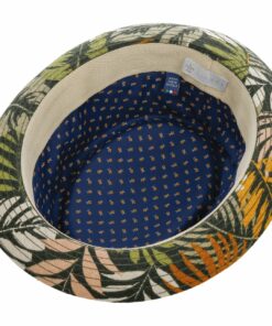 Colourful leaves on a dark background and skin-friendly materials make the pork pie hat a summer hit. With a 100% linen upper and breathable cotton lining, it is comfortable to wear and provides good heat and moisture exchange on hot days. The upward curved brim gives the fabric hat its characteristic appearance.
