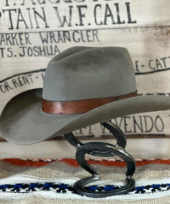 This light belly and it’s tan tones fit the bill with the black trim. The pinched front crown is 4.5″ in the back with a slight slope to 4″ in the front. The 4″ brim has a soft roll on the sides with a black bound edge. The 7/8″ grosgrain ribbon has an old fashioned look with a Cross concho to anchor it. Overall this hat is very unique with it’s look, band and style.